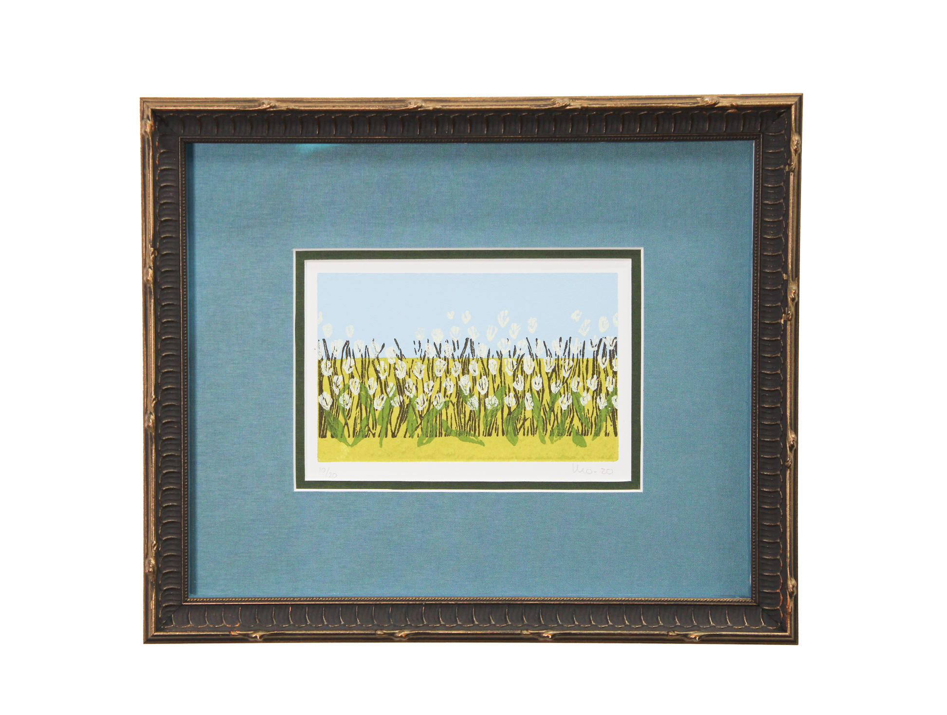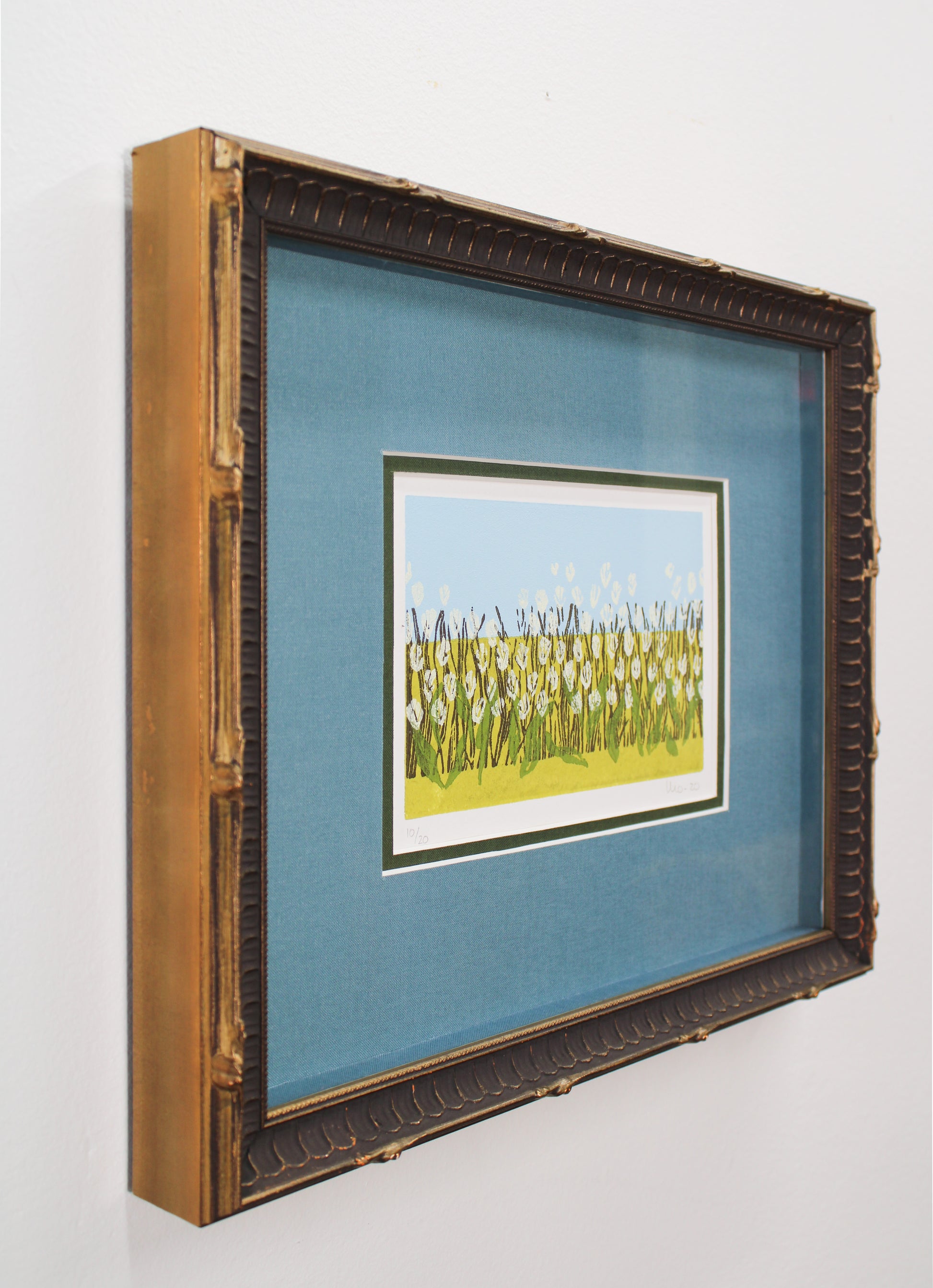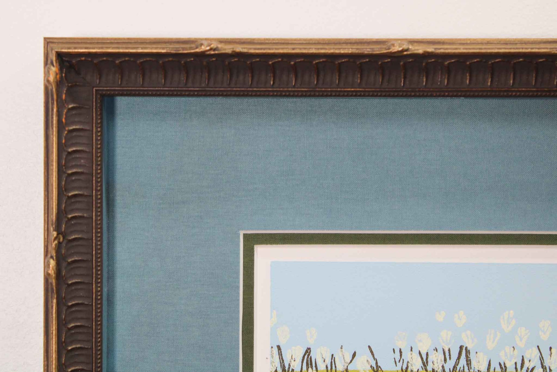 Description: Gold leaf and deep purple frame with blue and green linen double mat, linen side spacers