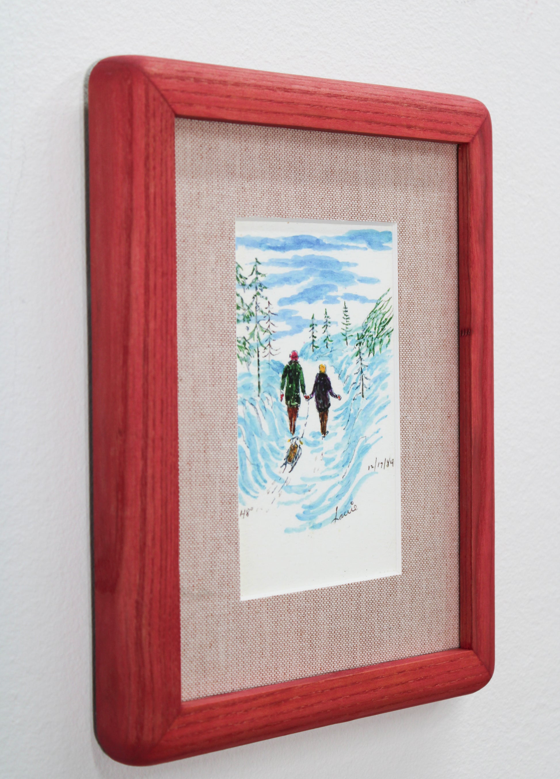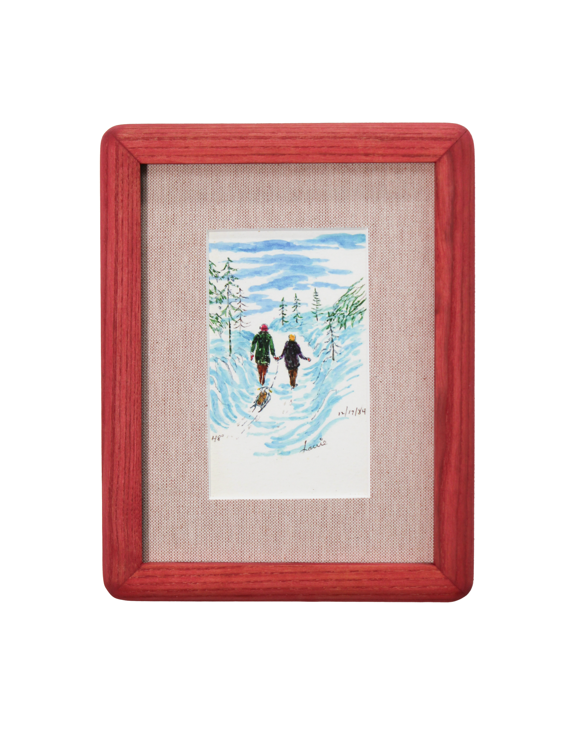 Description: Olive & Melon ash wood frame, stained in a pink linseed oil, pink and white linen mat