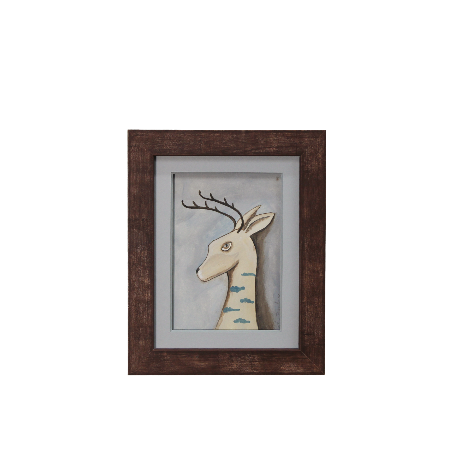 Description: Deep purple, distressed finished frame, Floated on a grey blue mat