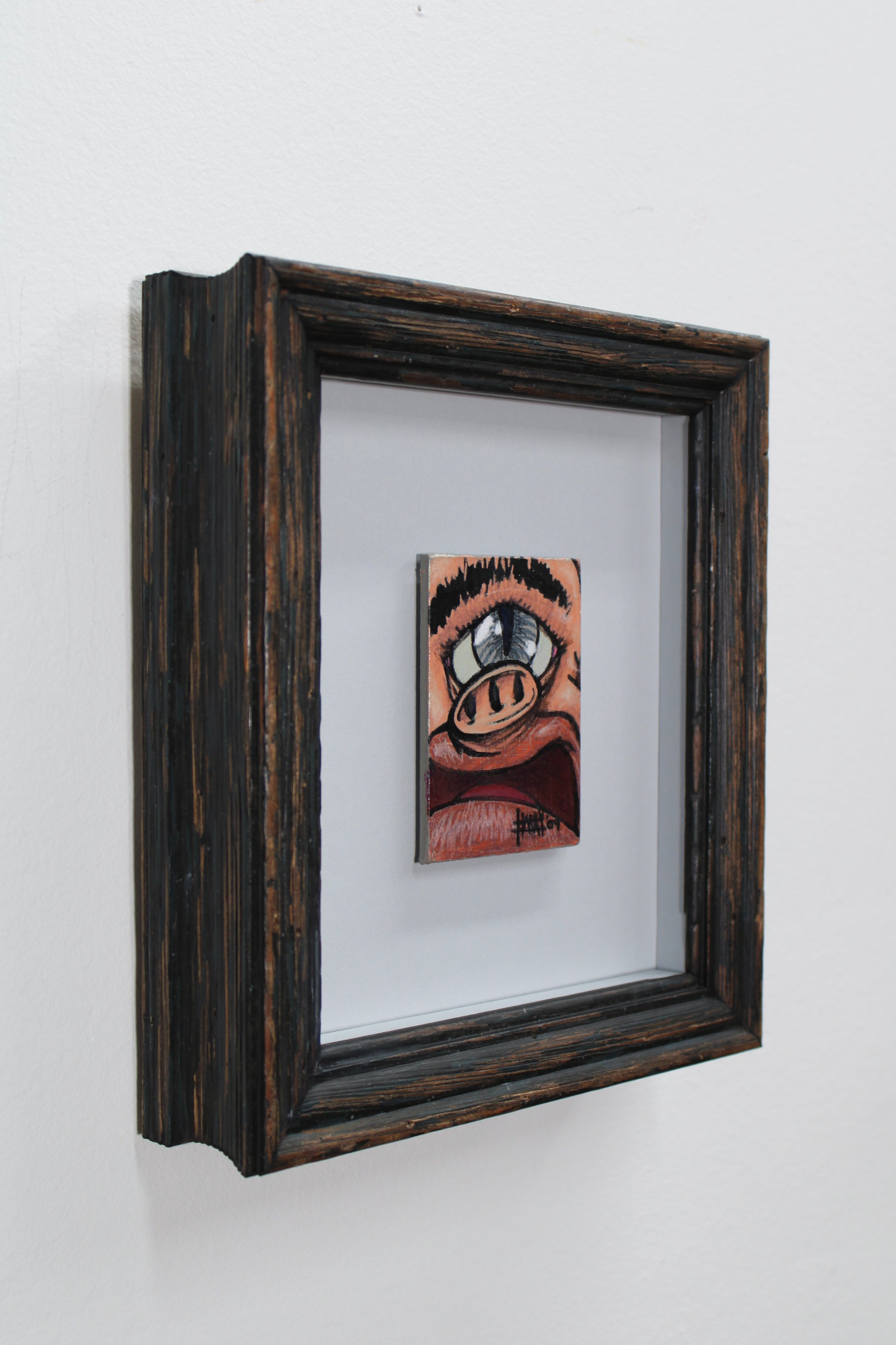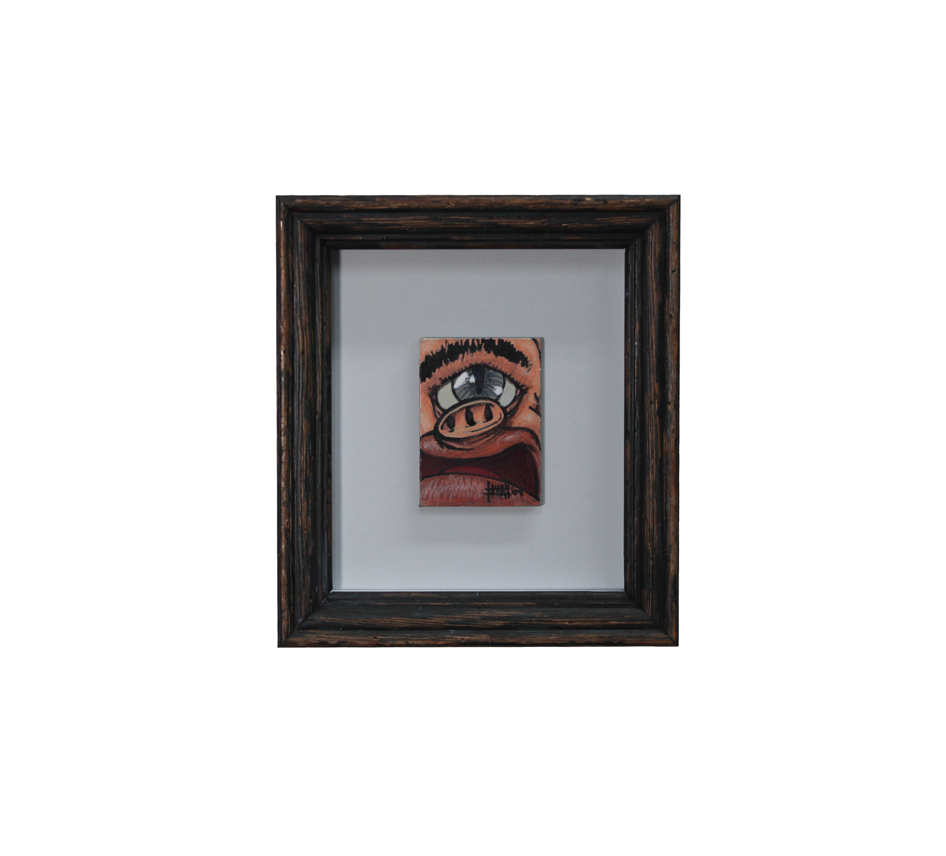 Description: Black distressed. deep frame, floated on a blue grey mat