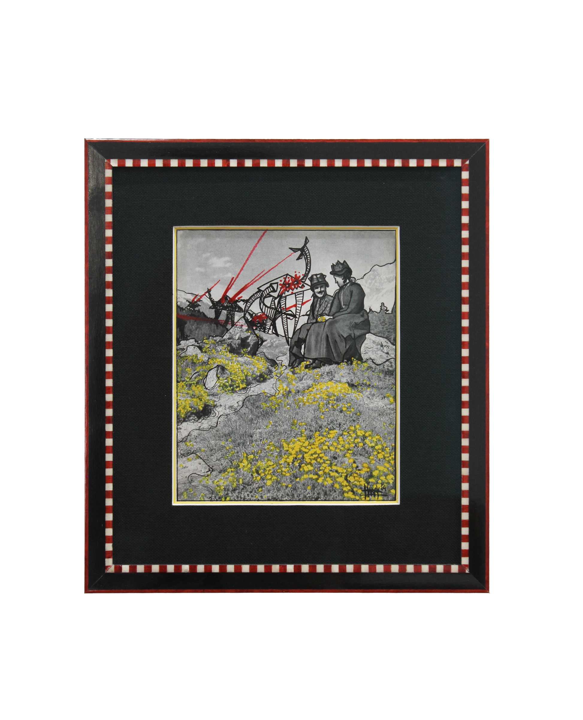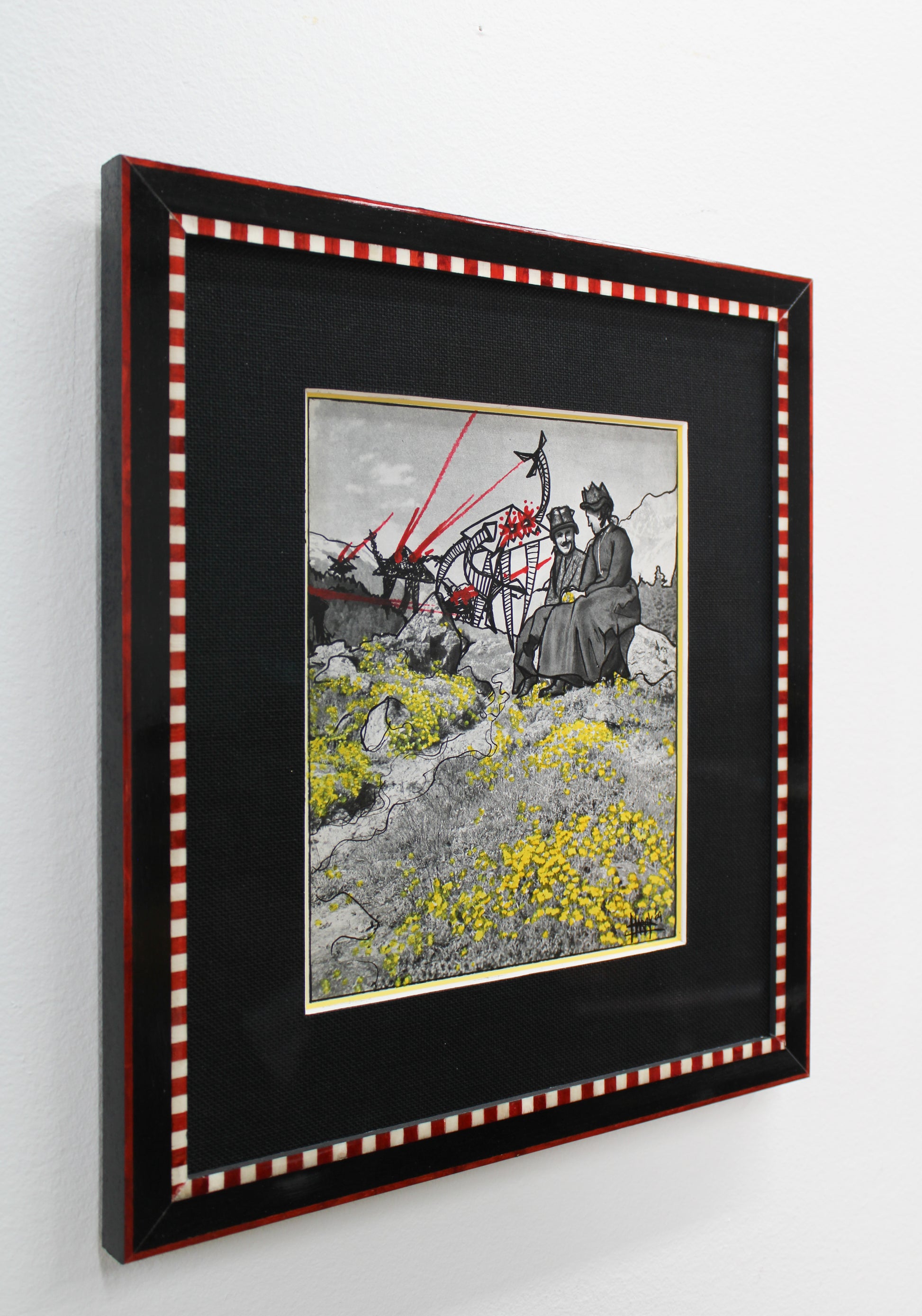 Description: Red, black and white inlay checkered frame, black line and yellow double mat