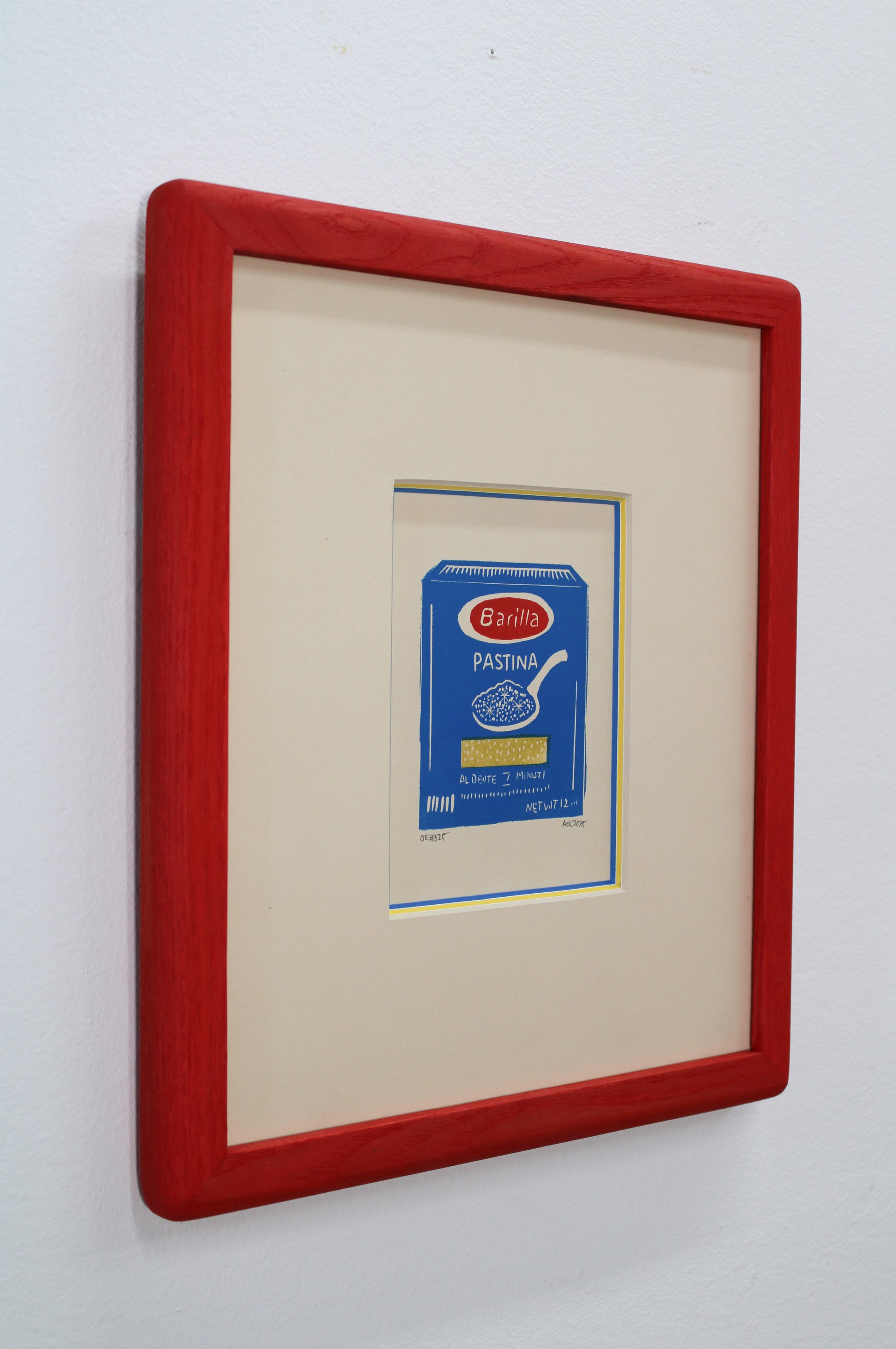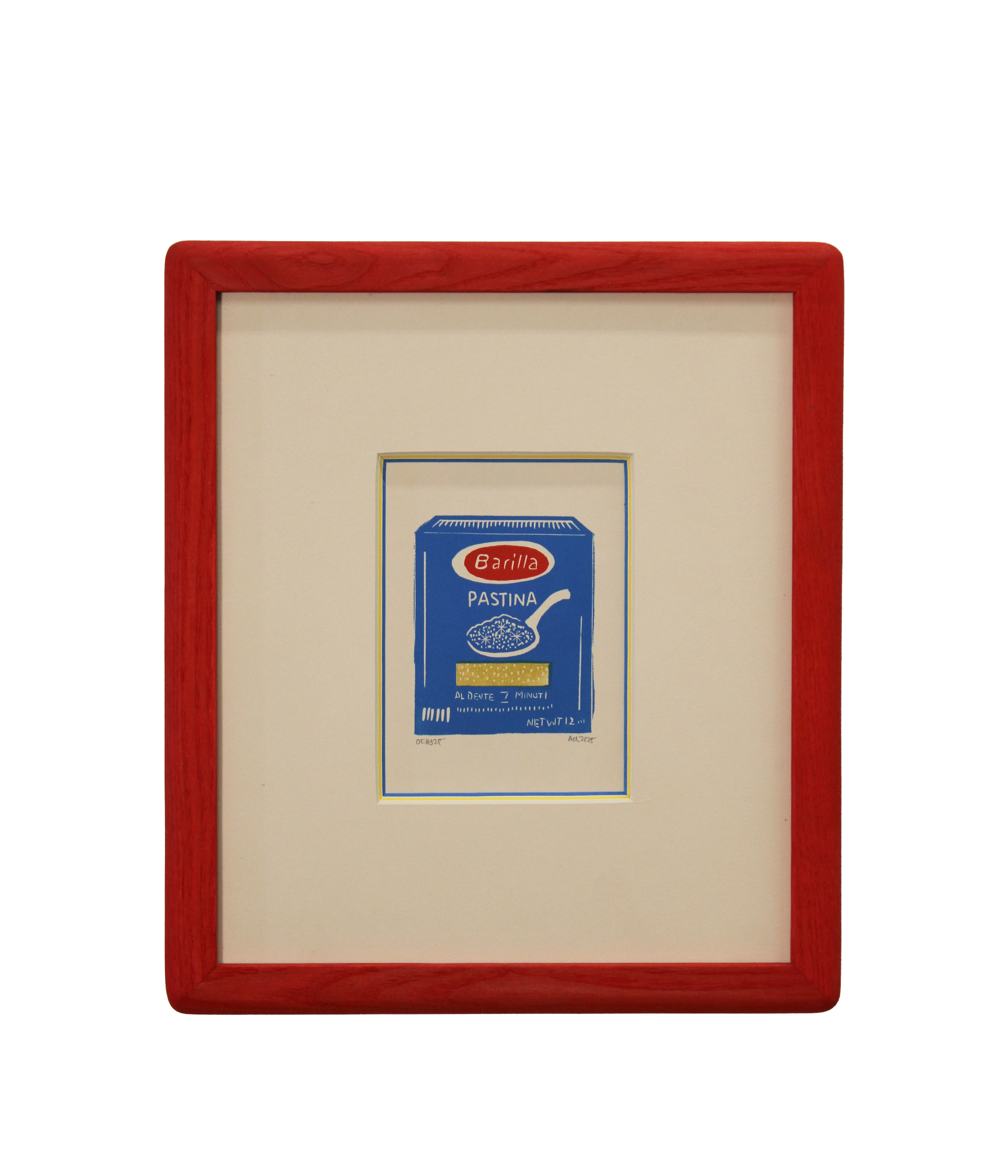 Description: Olive & Melon ash wood frame, stained in a red linseed oil, off white, blue and yellow triple mat