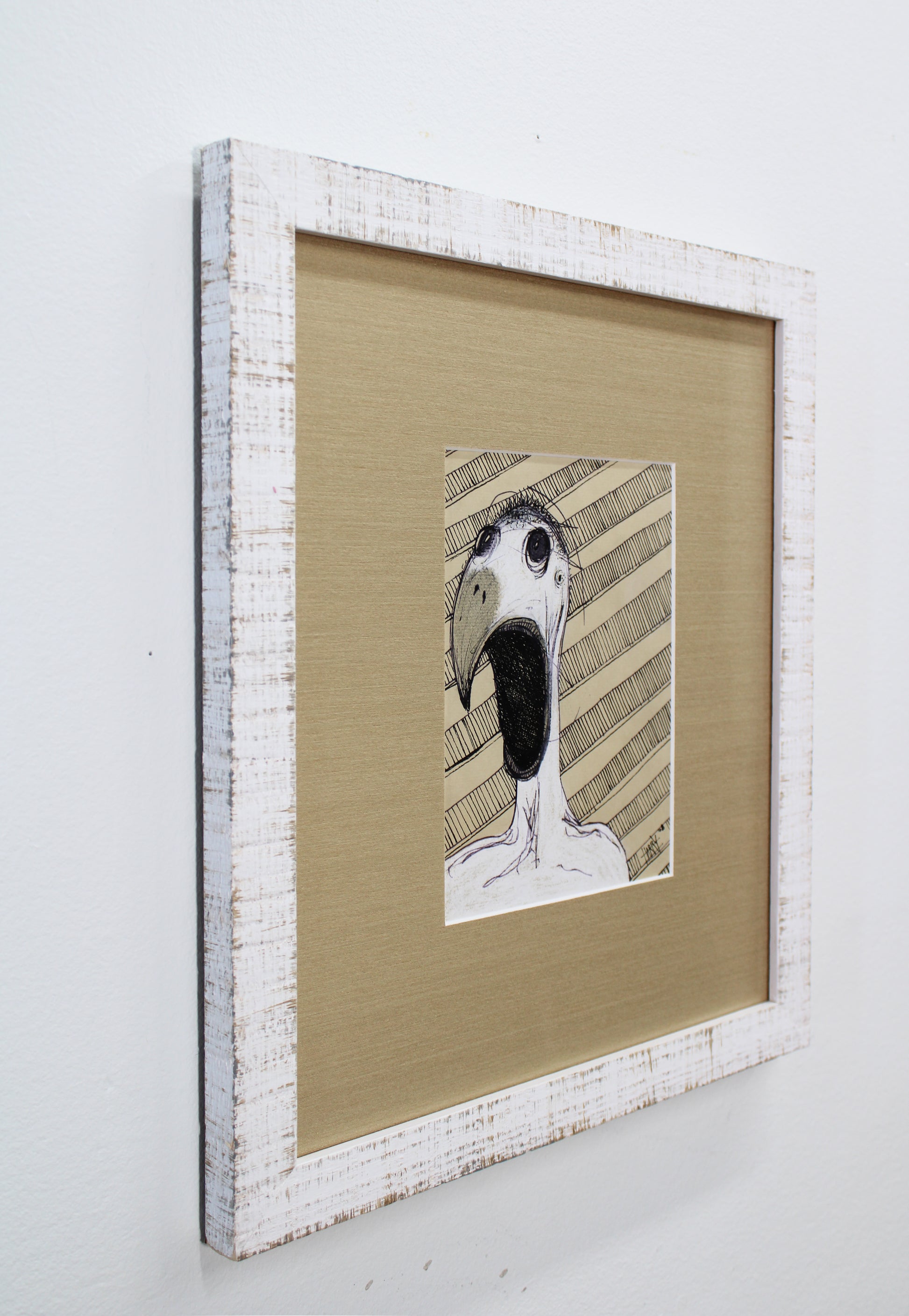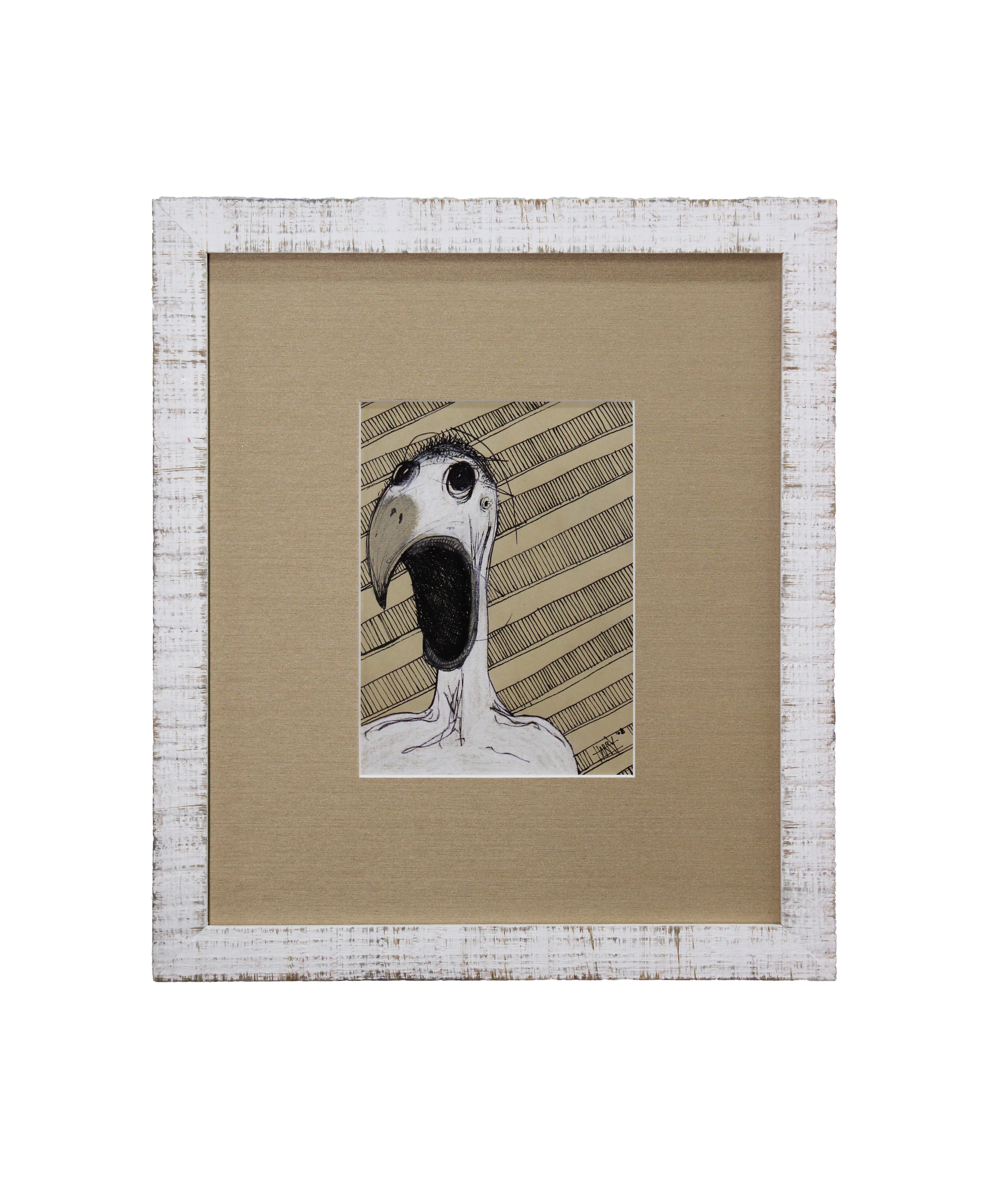 Description: Distressed white frame, light brown linen frame
